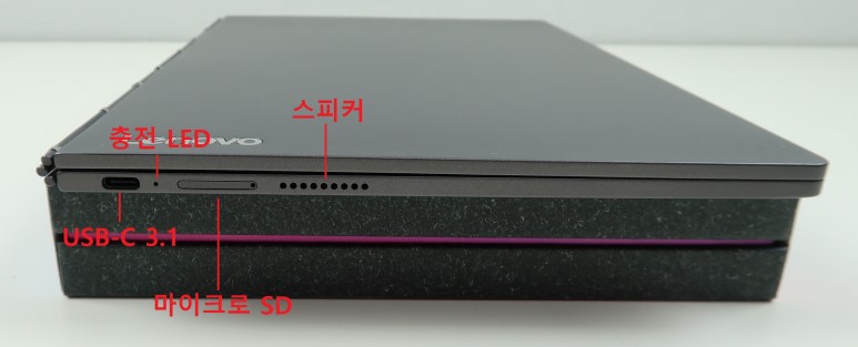 포트는 USB-C 3.1 포트가 양쪽에 한 개씩 있는 게 전부입니다. 이어폰 단자도 없는데, 그나마 오른쪽에 있는 USB-C 포트가 오디오도 지원 되니 동글을 사용하면 오디오 연결이 가능하긴 합니다. 태블릿이라 생각하면 납득 가능하지만, 노트북이라 생각하면 조금 아쉬운 포트 구성입니다.