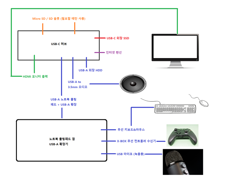 많기도 하네요… 사실 이걸 다 연결하는데 Satechi USB-C 허브로도 모자랍니다. 그래서 USB-A 확장 기능이 있는 노트북 쿨러를 사용해서 멀티탭을 줄줄이 연결하듯이 USB-A 포트를 확장해서 사용하는 중입니다.