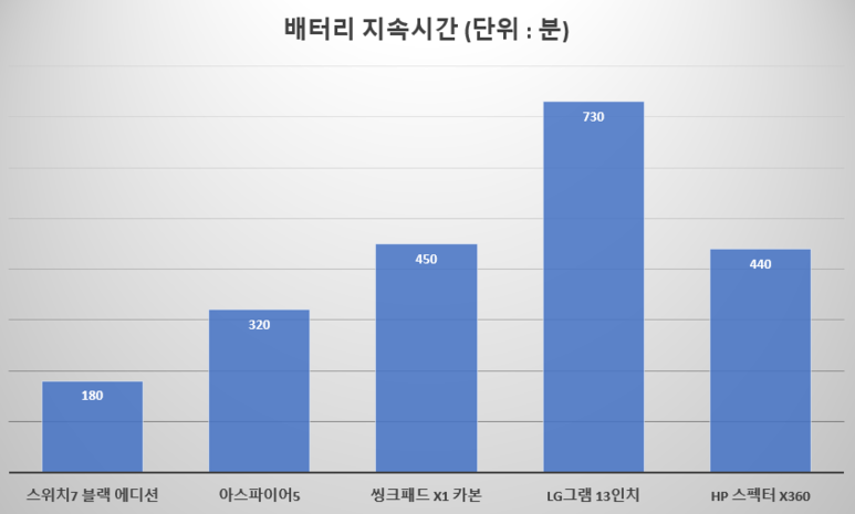 동세대 노트북들과 배터리 시간을 비교해보면 확실히 짧은 편입니다. 하지만 내부에 배터리를 넣을 공간이 부족한 태블릿과 노트북을 비교한다는 것 자체가 불공평하기 때문에 하단의 비교 그래프는 참고 용도로만 봐주시기 바랍니다.
