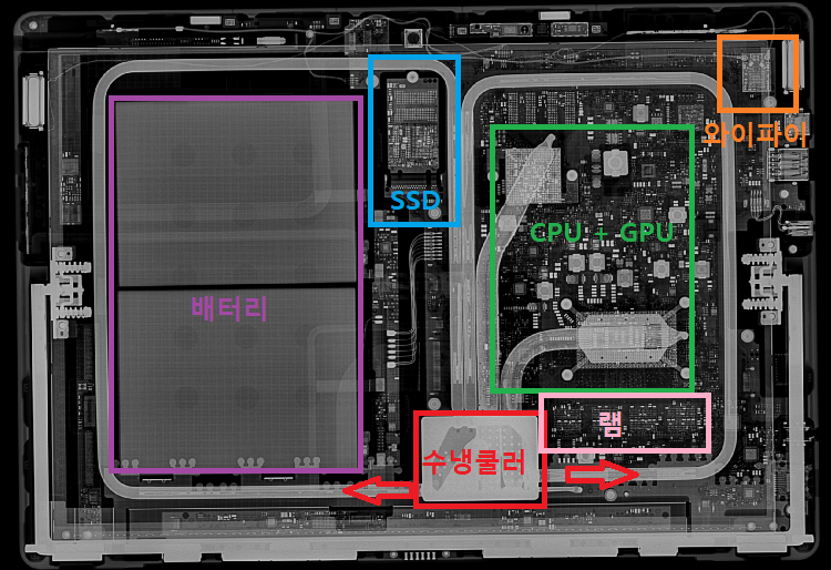 CPU와 GPU의 히트파이프가 수냉쿨러로 이어지고, 수냉 쿨러는 기기의 외곽으로 열을 분산시켜서 후면의 알루미늄판을 통해서 냉각시키는 구조로 보입니다. 공식 홍보자료에 나온 구조와 일치하는 모습입니다.