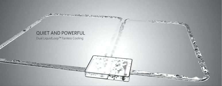 요약해드리자면, 수냉식 쿨러가 직접적으로 외부로 열을 발산시키는 것이 아니라 CPU 코어의 열을 태블릿 전체로 분산시켜주고, 분산된 열 자체는 후면의 알루미늄을 통해 자연적으로 해소되어야 하는 구조입니다.