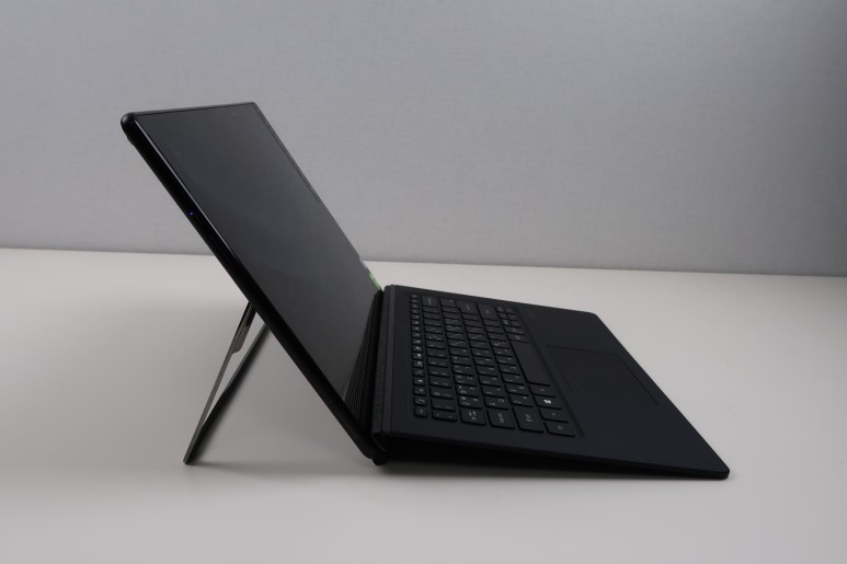 하지만 내부의 고성능 하드웨어 때문에 기기가 상당히 무겁다는 것은 분명 단점입니다. 본체 기기만 거의 1.2kg에 달하는데, 일반적인 울트라북과 거의 비슷한 수준이죠. 여기에 키보드까지 추가로 장착하면 1.6kg가 됩니다.