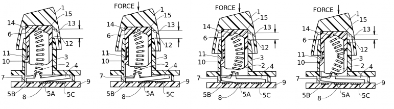 키캡과 멤브레인 사이에 있는 스프링이 특이하게도 수직으로 눌리는 것이 아니라 압력을 받으면 조금씩 휘다가 결국 꺾이게 되고, 그 순간의 장력으로 인해 하단의 멤브레인 스위치가 작동되는 방식입니다.