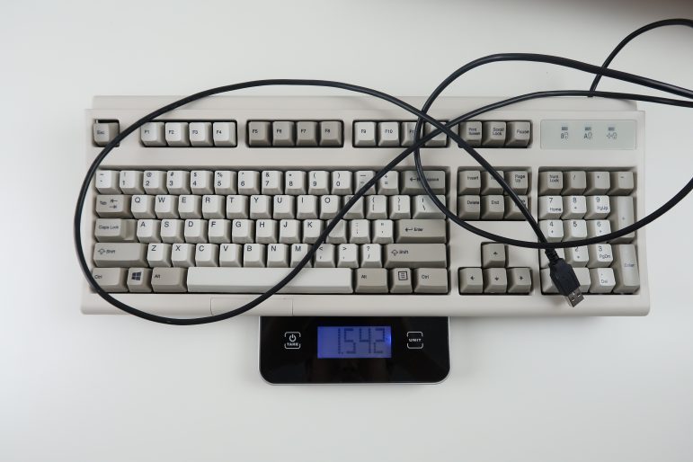 무게는 최신 키보드와 비교하면 많이 무거운 편이지만, 기존에 두꺼운 철판으로 후면을 보강하던 구형 모델M과 비교하면 매우 가볍다고 할 수 있습니다. 그 대신 모델M 특유의 탱크같은 탄탄한 느낌은 없지만요.
