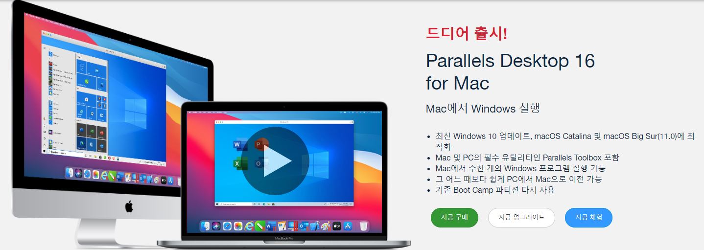 기본적으로 윈도우 부트캠프 기능을 제공해주던 맥북 시리즈와는 달리, M1 칩은 윈도우 지원이 불가능합니다. 다만 패러랠즈(Parallels)라는 외부 프로그램을 통해 윈도우10을 가상화 기능으로 구동할 수는 있더라고요. 패러랠즈는 원래 유료 서비스이고, 현재 M1 칩 호환성 테스트를 위해 무료 체험판 라이센스 사용이 가능합니다.
