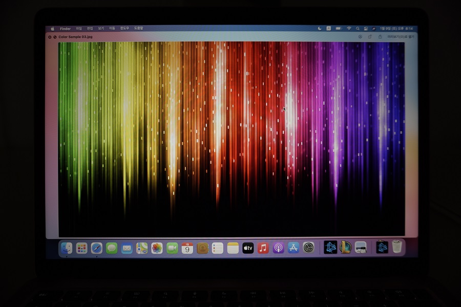 패널은 약간 반사가 있는 유광 코팅입니다. 그래도 반사가 심한 수준은 아니고 최대 밝기도 대부분 350니트로 높게 올라가는 편이기 때문에 사용하면서 거슬린다고 생각된 적은 없었어요. 참고로 맥북프로 M1 모델은 맥북에어보다 화면 밝기가 50니트 정도 더 밝지만, 저는 개인적으로 350니트도 차고 넘친다고 봅니다.