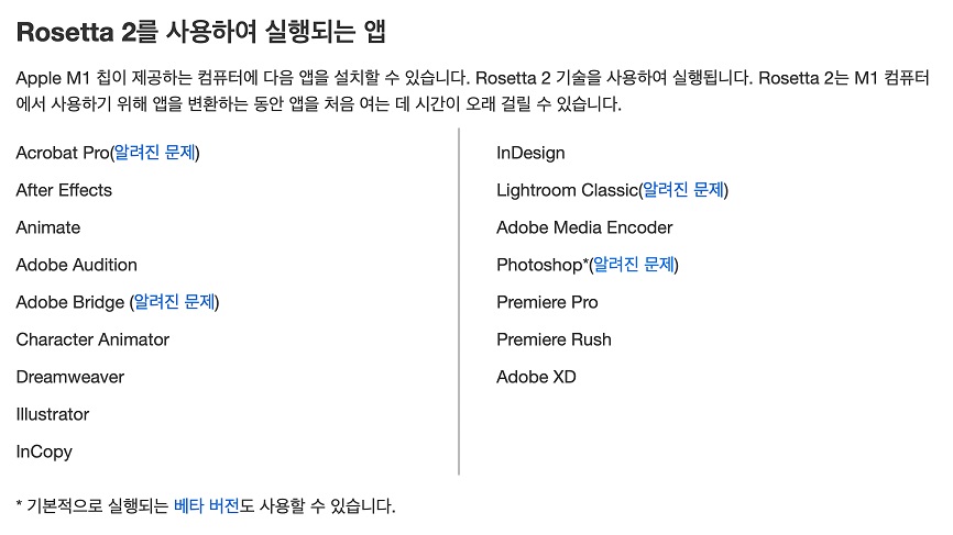 이건 제가 함부로 답변을 드리기 보다는 어도비의 공식 답변을 첨부해드릴게요. 대부분 로제타2 가상화 기능으로 구동해야 하지만, OpenGL 기반으로 구동되는 프로그램은 호환성 문제가 있다고 합니다. 어도비도 이를 인지하고 최적화 작업을 최대한 빠르게 진행해줄 것이라고 하더군요.