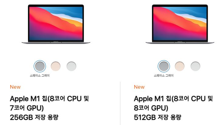저는 개인적으로 어차피 맥북에어로 엄청난 게임이나 그래픽 편집 작업을 할 이유는 없다고 생각하기 때문에 그냥 저렴하게 7코어 모델을 추천드리고 싶습니다. 동일한 SSD 용량을 기준으로 볼 경우 순수 GPU 업그레이드 비용은 약 10만원 정도로 생각하면 되겠습니다.