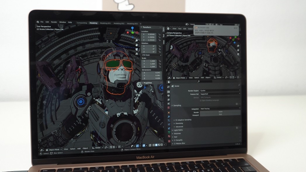 블랜더 3D 역시 로제타2 가상화 상태였지만, 의외로 성능이 나쁘지는 않았습니다. 본격적인 편집 작업은 힘들겠지만 파일 조회나 간단한 렌더링 정도는 충분히 소화 가능할 것으로 보이네요.