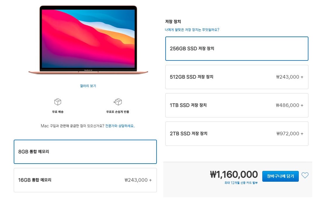 그렇기 때문에 저는 이번 M1 맥북에어는 딱 기본 8GB램, 256GB SSD 사양은 가성비가 좋다고 생각하고, 업그레이드 옵션이 들어가는 순간 다른 대안을 찾아보기 시작할 것 같습니다. 요즘 8GB 램 부품 가격이 3~4만원이라는 점을 생각하면 도저히 24만원이나 투자하면서 업그레이드 옵션을 선택할 마음이 들지 않네요.