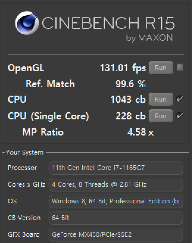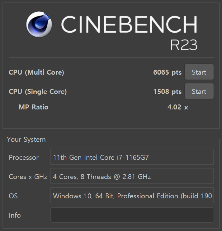 Cinebench는 CPU의 성능을 100% 활용해서 특정 이미지를 얼마나 빠르게 렌더링하는지 여부를 평가하는 항목. 최신 R23 버전이 테스트 시간이 가장 길기 때문에 발열로 인한 성능 차이가 하위 버전보다 더 뚜렷하게 나타나는 경향이 있다. 싱글코어 테스트는 대체로 발열과 크게 관계가 없는 편이다.