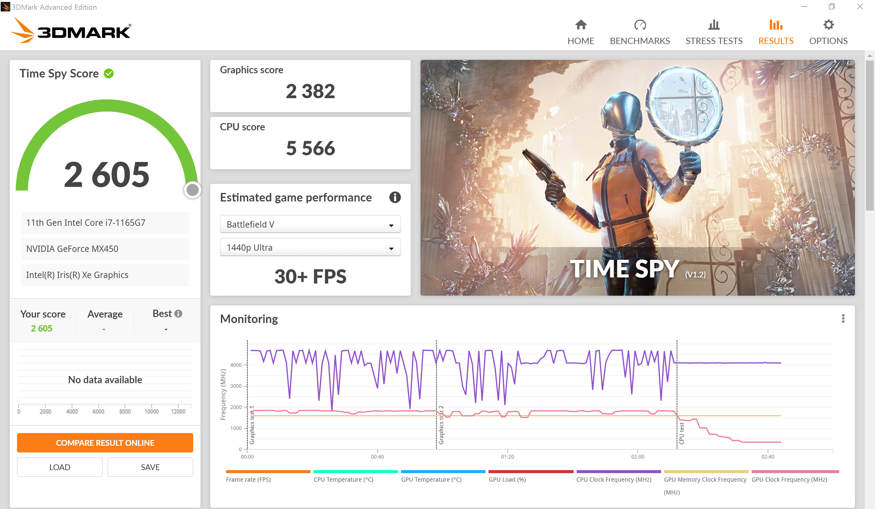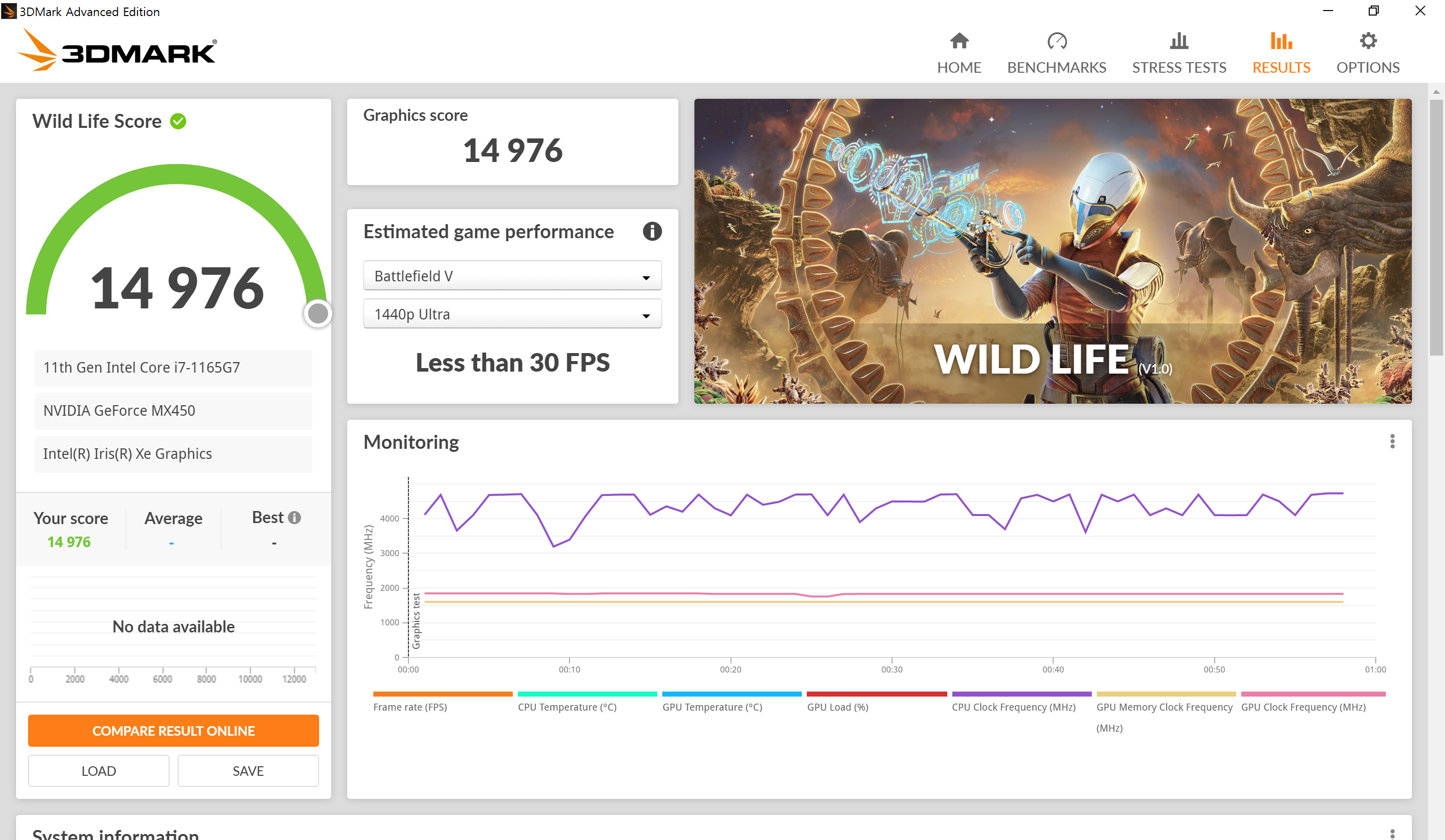 노트북의 스펙에 알맞다고 판단되는 그래픽 옵션으로 게임을 구동했을 때 유지되는 프레임 값을 측정한 것. 일반적으로 평균 프레임이 디스플레이의 한계 주사율(Hz)에 근접하는 패턴이 가장 이상적이며, 쾌적한 플레이를 위해서 최소 60FPS 이상으로 구동되는 것이 좋다.