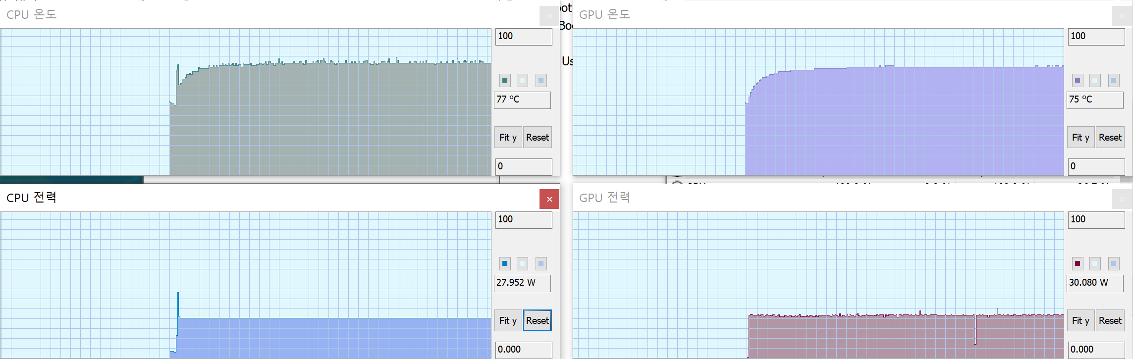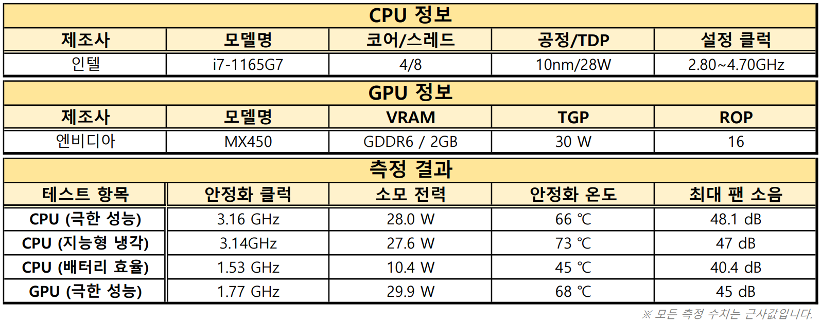 CPU나 GPU에 100% 부하를 주는 상황에서 노트북이 각 하드웨어에 전력을 얼마까지 공급할 수 있는지, 그리고 해당 전력을 유지할 때 내부 온도가 어느 정도로 유지가 되는지 확인하는 테스트. 유지 가능한 전력이 높을수록 대체로 성능이 좋지만, 내부 온도나 팬 소음이 커지는 경향이 있다.