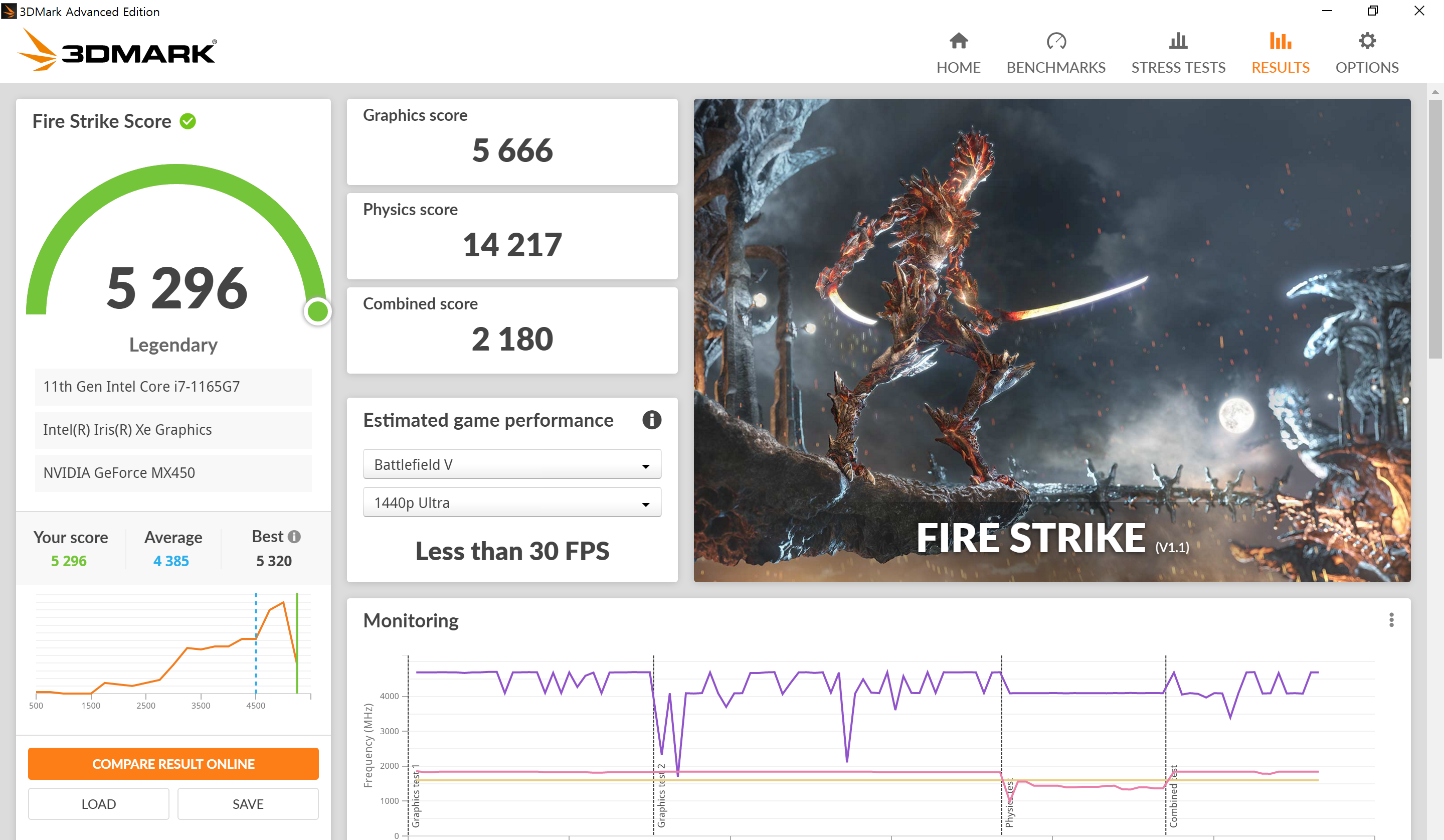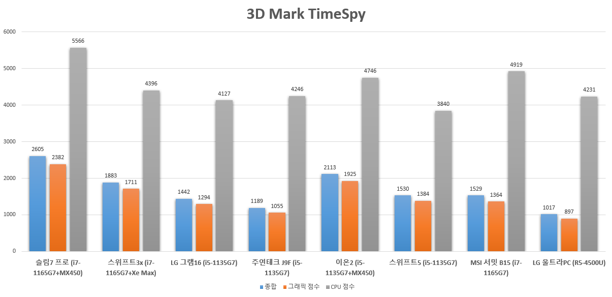 비슷한 스펙의 제품군 중에서 모든 방면에서 가장 높은 점수를 기록했습니다. 특히 과거에 GTX1050 게이밍 노트북들이 FireStrike 점수가 5000~6000점대가 나왔다는 점을 감안하면 저전력 노트북의 성능이 많이 향상됐다는 것을 느낄 수 있겠더라고요.