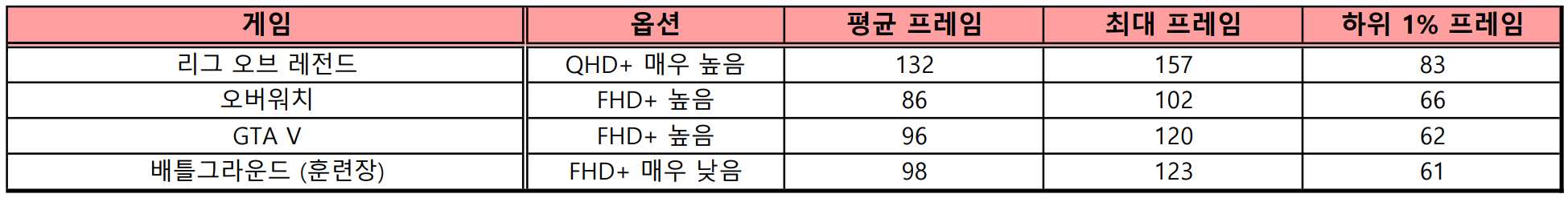 아무리 평균 프레임이 좋아도 하위 1% 프레임이 낮으면 순간적인 렉이 많다는 의미이기 때문에 플레이 경험이 쾌적하지 못하다. (하위 1%는 최소 30~40FPS 이상을 기대)