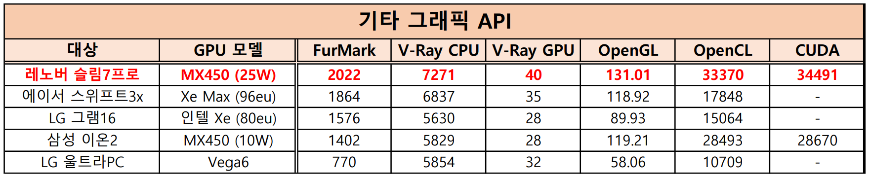갤럭시북 이온2의 MX450은 전력 설정도 더 낮고 그래픽 메모리도 GDDR5라서 OpenCL과 CUDA 점수를 제외하면 의외로 타이거레이크 내장그래픽과 큰 차이가 없습니다. 그러니 같은 MX450 그래픽이 달렸다고 해도 세부적인 전력 값과 VRAM의 종류를 확인하고 구매 결정을 내리셔야 할거 같아요.