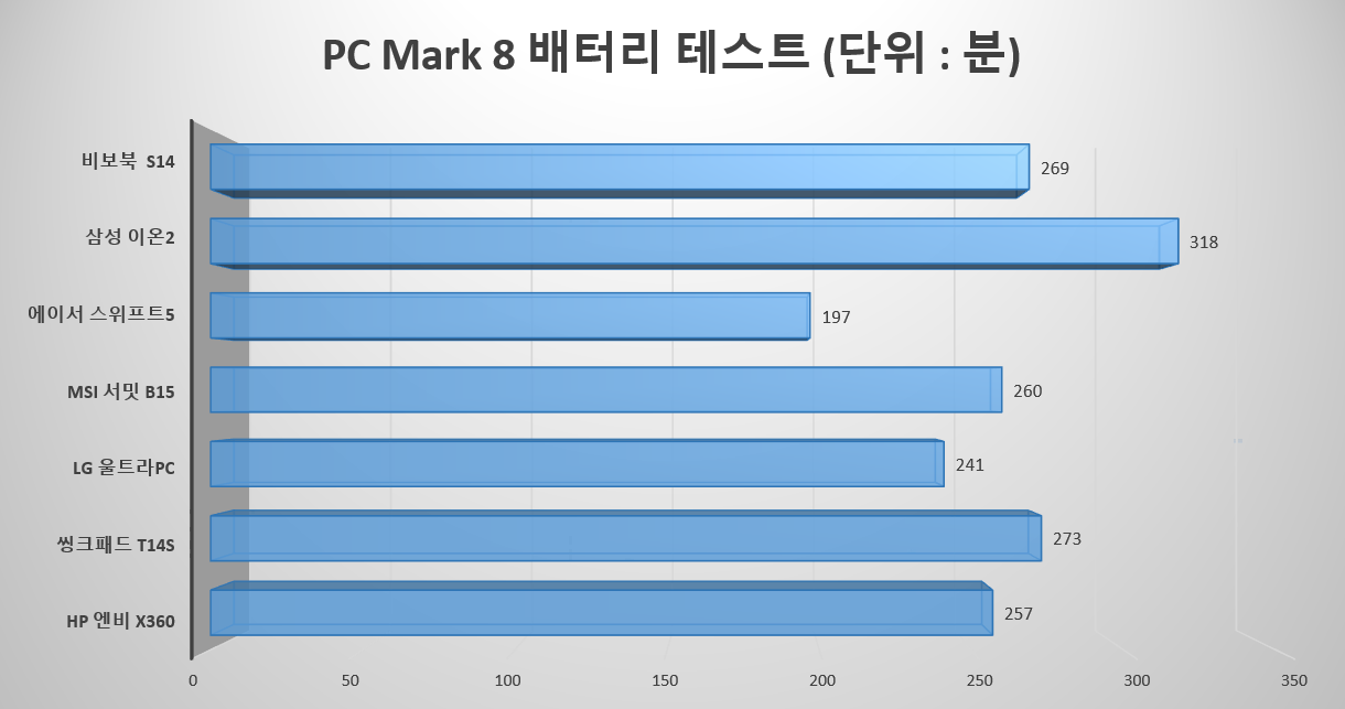 비보북 S14의 배터리 지속력은 평범한 편입니다. 제 개인적인 사용 패턴으로는 6시간 이상, PC Mark 8 테스트 기준으로는 4~5시간 정도를 기대하고 있다는 점을 감안하면 해당 기준치는 넉넉하게 넘겼다고 볼 수 있겠네요. 하루 종일 충전기 없이 사용하기에는 살짝 불안하지만 하루 종일 앉아서 일하는 사무직이 아닌 이상 일과 시간 중에 6시간을 연달아서 충전기 없이 사용해야 할 일은 드물죠.