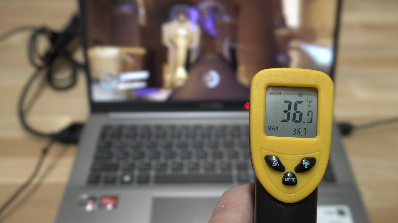 높은 전력을 감당하는 것에 비해 소음도 상당히 적은 편이어서 사용 중에 쾌적하게 느껴졌습니다. 팬이 최대 속도로 돌아갈 때에도 41dB 내외였고, 저소음 모드로 사용하면 거의 소음이 없는 수준이라서 조용한 환경에서도 충분히 사용 가능할 거예요. 표면 발열도 통풍구가 있은 키보드 우측 상단을 제외하면 30℃ 초중반대로 낮은 편이었습니다.