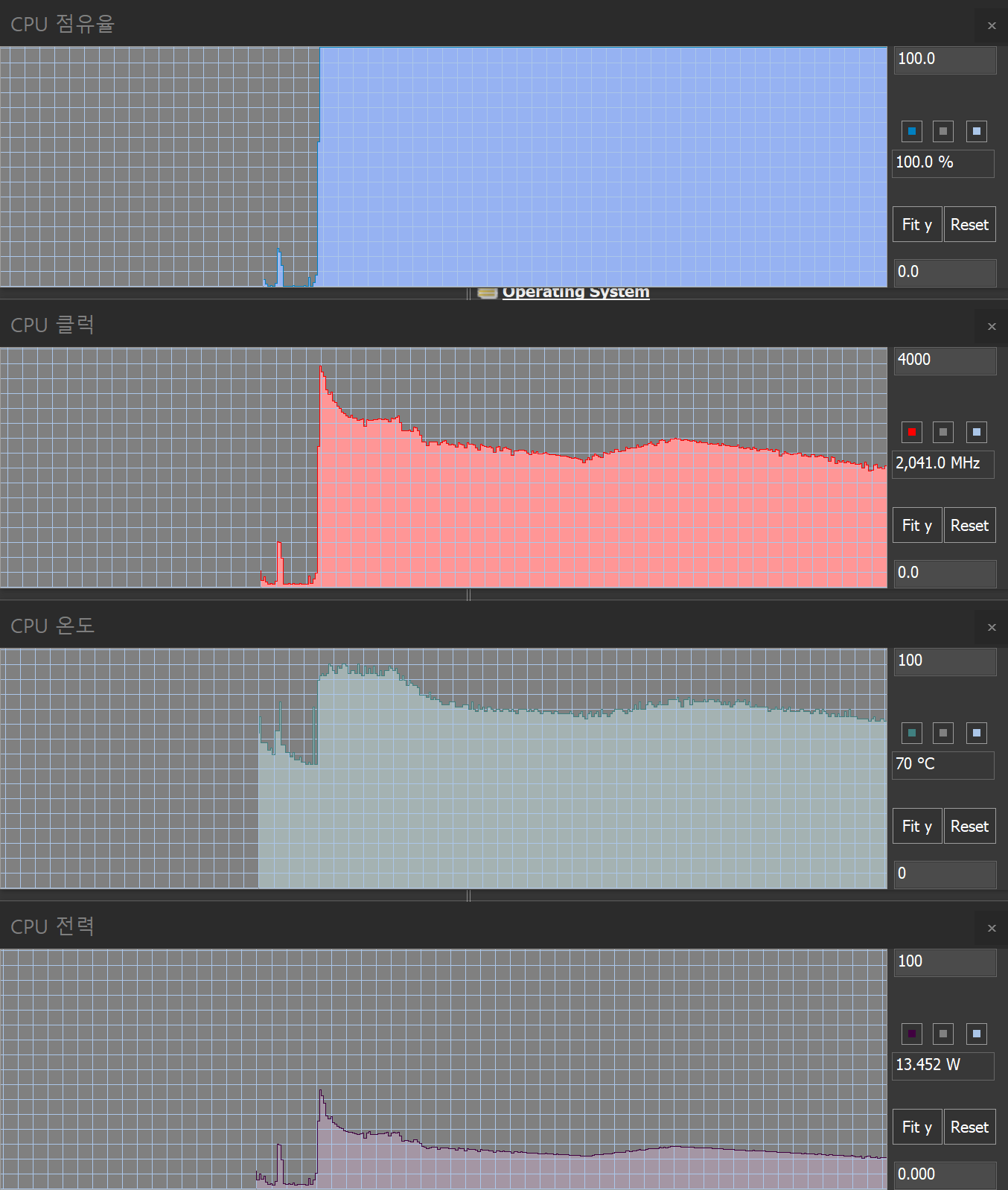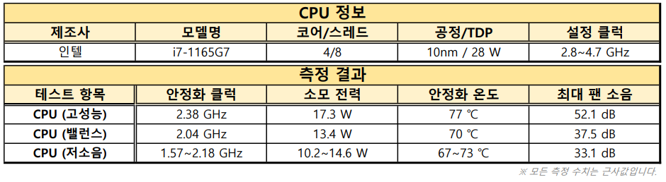CPU나 GPU에 100% 부하를 주는 상황에서 노트북이 각 하드웨어에 전력을 얼마까지 공급할 수 있는지, 그리고 해당 전력을 유지할 때 내부 온도가 어느 정도로 유지가 되는지 확인하는 테스트. 유지 가능한 전력이 높을수록 대체로 성능이 좋지만, 내부 온도나 팬 소음이 커지는 경향이 있다.