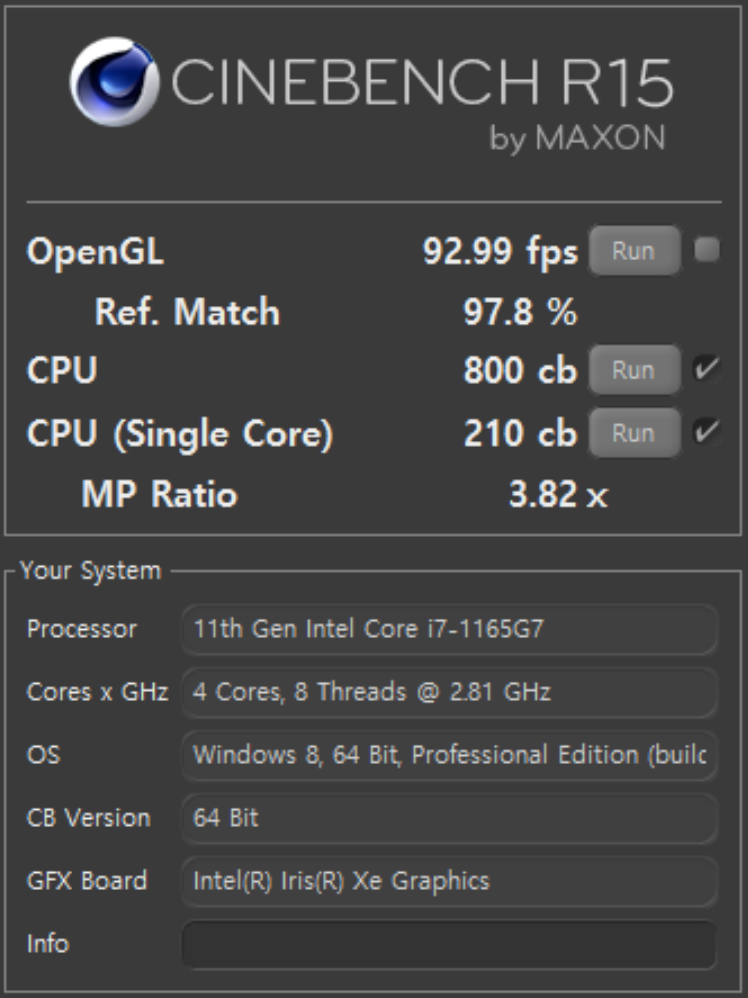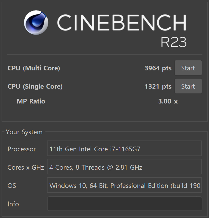 Cinebench는 CPU의 성능을 100% 활용해서 특정 이미지를 얼마나 빠르게 렌더링하는지 여부를 평가하는 항목. 최신 R23 버전이 테스트 시간이 가장 길기 때문에 발열로 인한 성능 차이가 하위 버전보다 더 뚜렷하게 나타나는 경향이 있다. 싱글코어 테스트는 대체로 발열과 크게 관계가 없는 편이다.