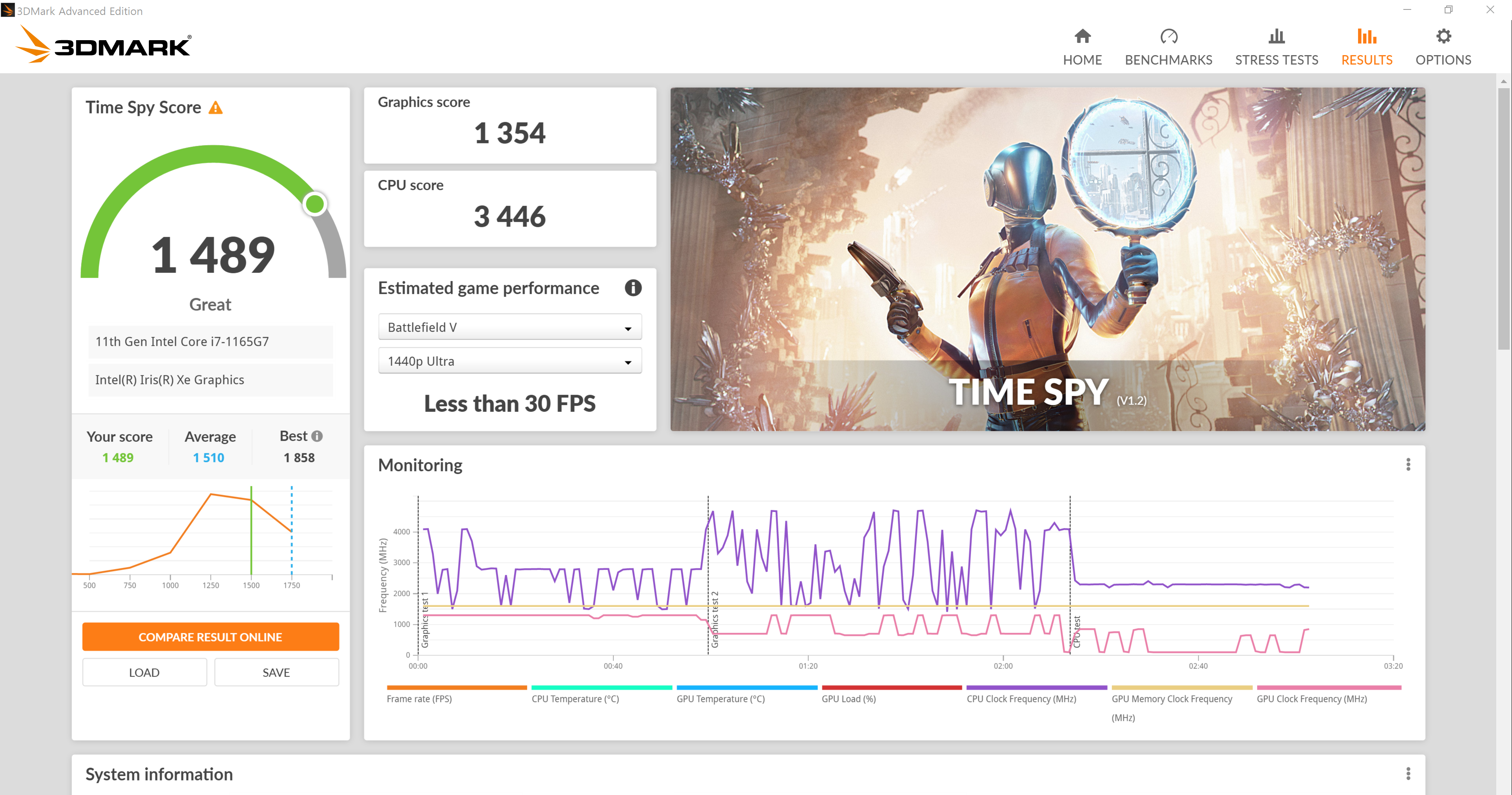 노트북의 스펙에 알맞다고 판단되는 그래픽 옵션으로 게임을 구동했을 때 유지되는 프레임 값을 측정한 것. 일반적으로 평균 프레임이 디스플레이의 한계 주사율(Hz)에 근접하는 패턴이 가장 이상적이며, 쾌적한 플레이를 위해서 최소 60FPS 이상으로 구동되는 것이 좋다.