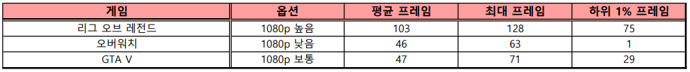 아무리 평균 프레임이 좋아도 하위 1% 프레임이 낮으면 순간적인 렉이 많다는 의미이기 때문에 플레이 경험이 쾌적하지 못하다. (하위 1%는 최소 30~40FPS 이상을 기대)