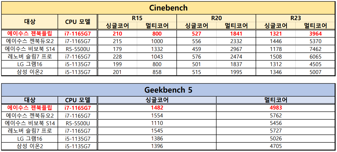 Geekbench는 보다 CPU에 부담이 적은 문서 편집, 파일 압축과 같은 작업을 평가하는 항목이기 때문에 상대적으로 Cinebench에 비해서 발열로 인한 점수 편차가 거의 없는 편이다.