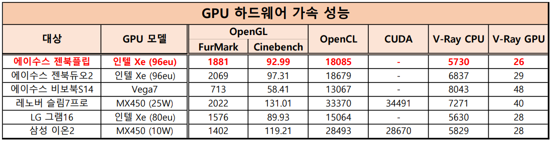 본인이 주로 사용하는 프로그램이 OpenGL, OpenCL, CUDA 기반인지 확인한 다음 필요한 항목의 점수를 집중적으로 비교하는 것을 권장한다.