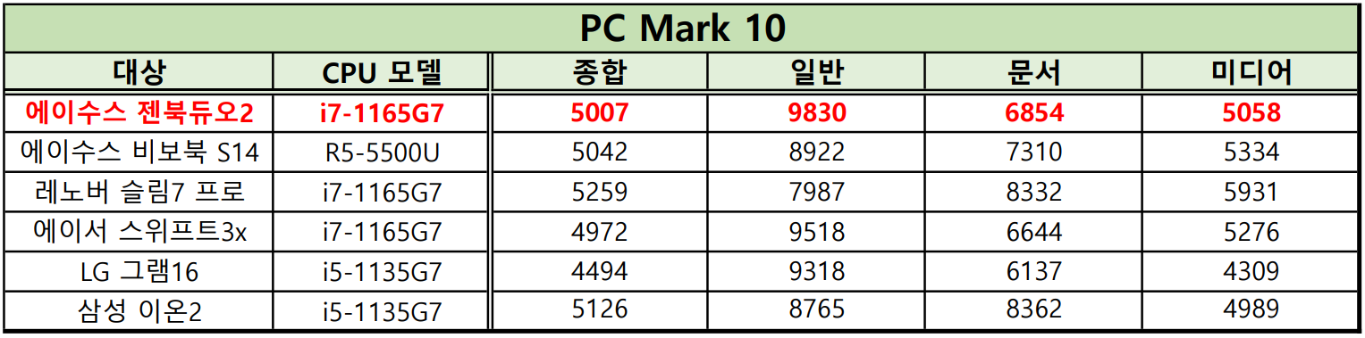벤치마크 포스팅을 보시면 자세히 설명했는데, 젠북듀오는 동급 타이거레이크 노트북 중 최상급 발열제어와 성능을 자랑합니다. 일반적인 젠북 시리즈는 쿨링 구조가 살짝 부족한 편인데, 젠북듀오는 오히려 게이밍 시리즈인 제피러스 시리즈의 설계와 비슷한 점이 더 많기 때문이겠죠.
