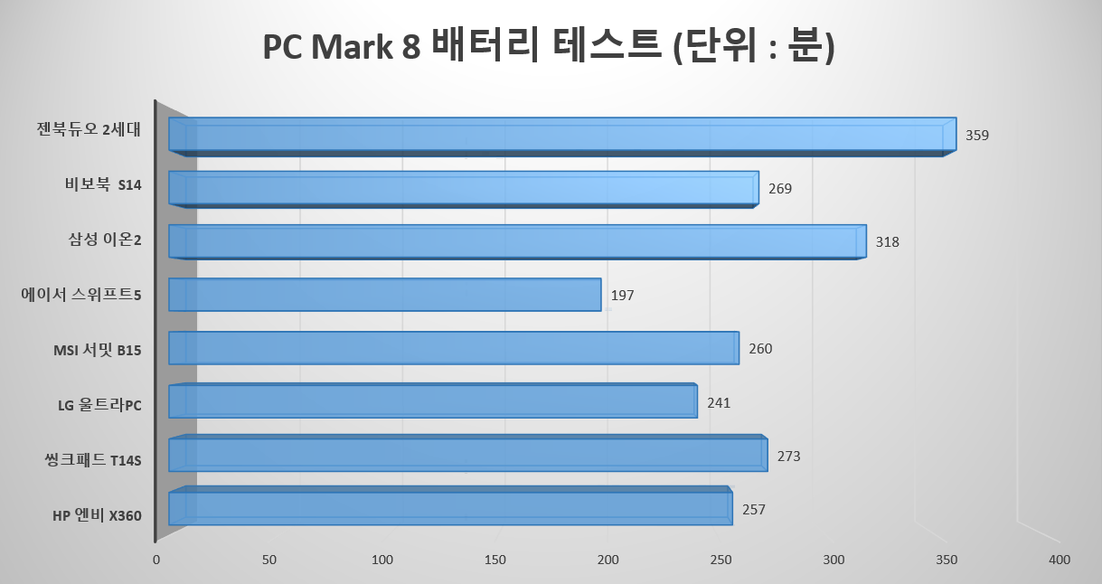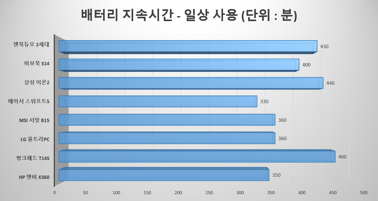 모든 면을 종합해서 보면 보조 디스플레이를 활용하지 않을 경우 배터리 지속시간은 평균적인 울트라북보다 좋은 편이고, 조금씩 사용하더라도 경쟁 기종과 크게 차이가 나지 않는 모습이었어요. 물론 보조 디스플레이를 100% 밝기로 적극 활용하신다면 노트북 사용 시간이 5~6시간 내외가 되지 않을까 싶네요.