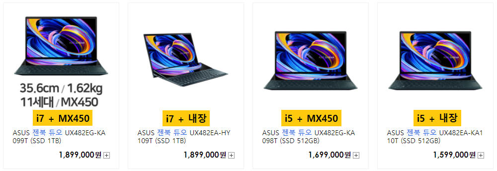 심지어 젠북듀오 1세대는 MX 그래픽이 기본적으로 탑재되어 있었는데, 이번 신형 2세대 모델은 내장그래픽이 기본 사양이고, MX450 그래픽은 옵션이더라고요. 가격 차이도 많이 나지 않는 거 같으니 어지간하면 그냥 MX450 모델로 구매하는 것을 추천드리고 싶습니다.