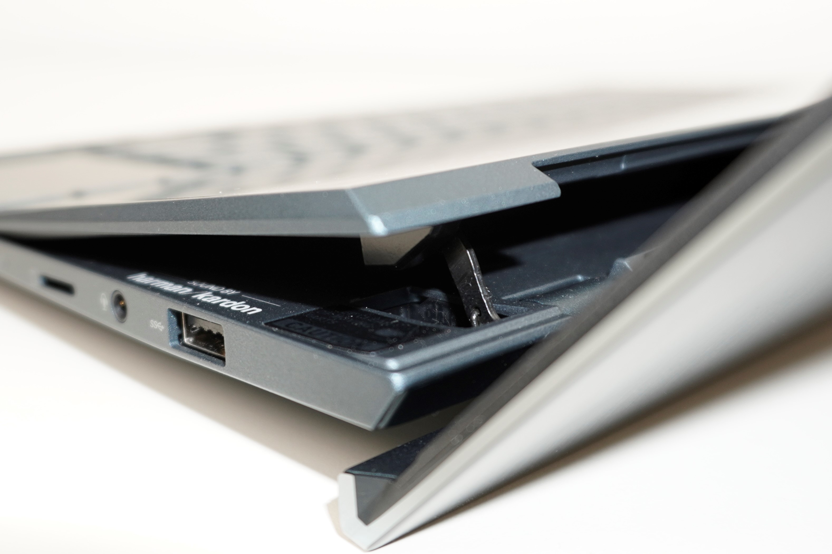 에이수스의 젠북 시리즈 중 상위 제품군은 마감이나 설계가 대체로 좋은 편입니다. 젠북듀오도 마찬가지고요. 하판 결합부나 재질 촉감, 마감에 대해서는 특별히 흠잡을 부분은 없었습니다. 노트북을 열었을 때 힌지가 바닥에 닿는 부위도 고무로 충실하게 보강해줬고요. 다만 알루미늄 제품의 특성상 긁힘에 대해서는 조금 취약할 수 있으니 주의하시기 바랍니다.