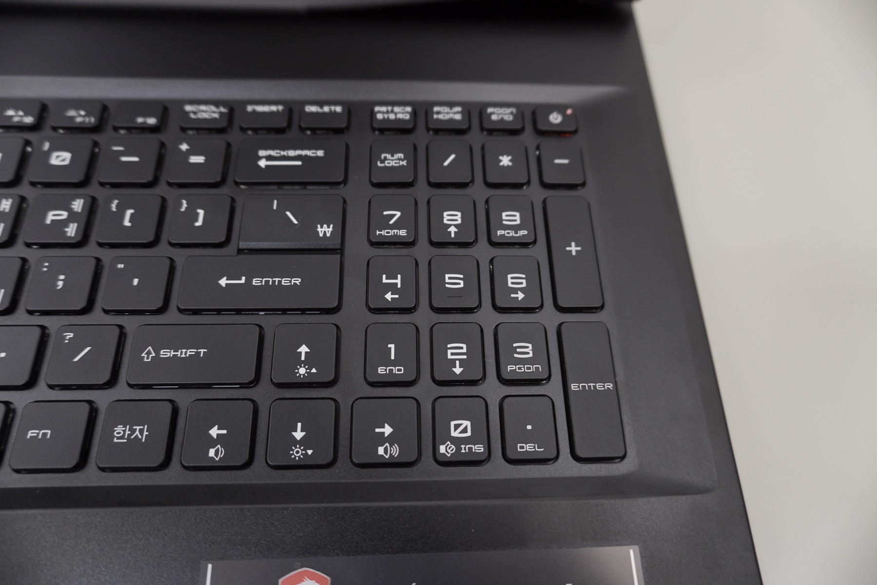 넘버패드도 키캡의 폭이 좁은 데다가 방향키도 넘버패드의 일부분을 침범하는 형태라 썩 손이 가지는 않더라고요. 키보드덱에 공간이 넉넉함에도 불구하고 이런 결정을 한 이유는 아마도 15인치형 GP66 모델과 동일한 부품을 사용하기 위해서였겠죠.