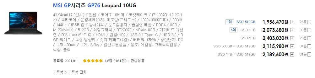 혹시 17인치 모델이 아닌 15인치 모델을 원하시는 분도 있을 것 같아서 동일 사양의 GP66 링크도 제공해드리겠습니다. 참고 용도로 글 작성일 (2021년 3월 23일) 기준 가격도 첨부했어요.