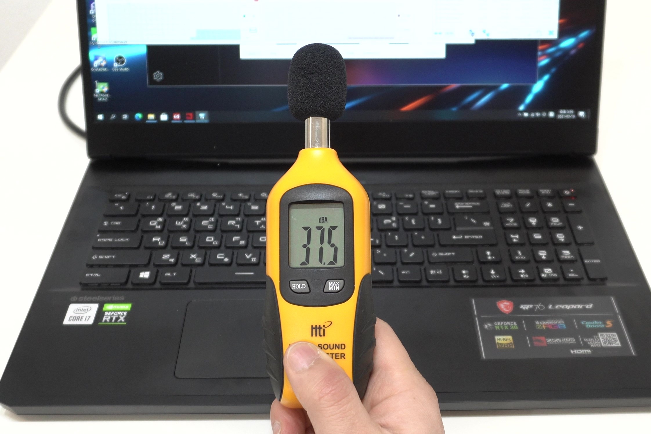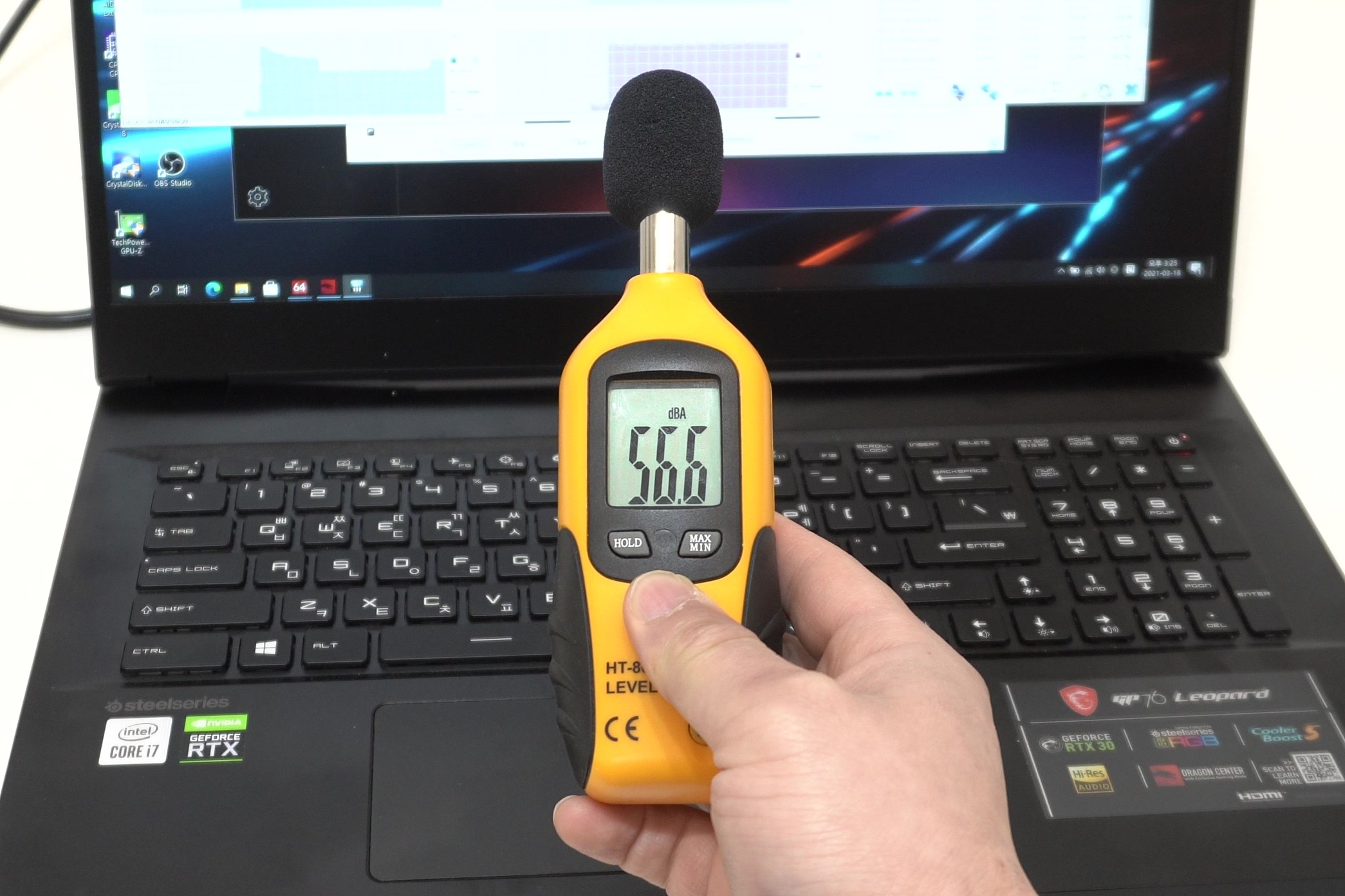 당연히 높은 성능을 뽑아내면 내부에 열이 많이 누적됩니다. 노트북이 그 열을 얼마나 잘 배출하느냐가 중요한 것이죠. 그래서 MSI GP76은 최대 성능 모드에서 팬 소음이 제법 시끄러운 편입니다. 제가 게이밍 노트북에서 최대 소음이 55dB이 넘어가면 불편하다고 느끼기 시작하는 편인데, 이 녀석은 최대 성능 모드에서 56.6dB까지 측정이 되더라고요.