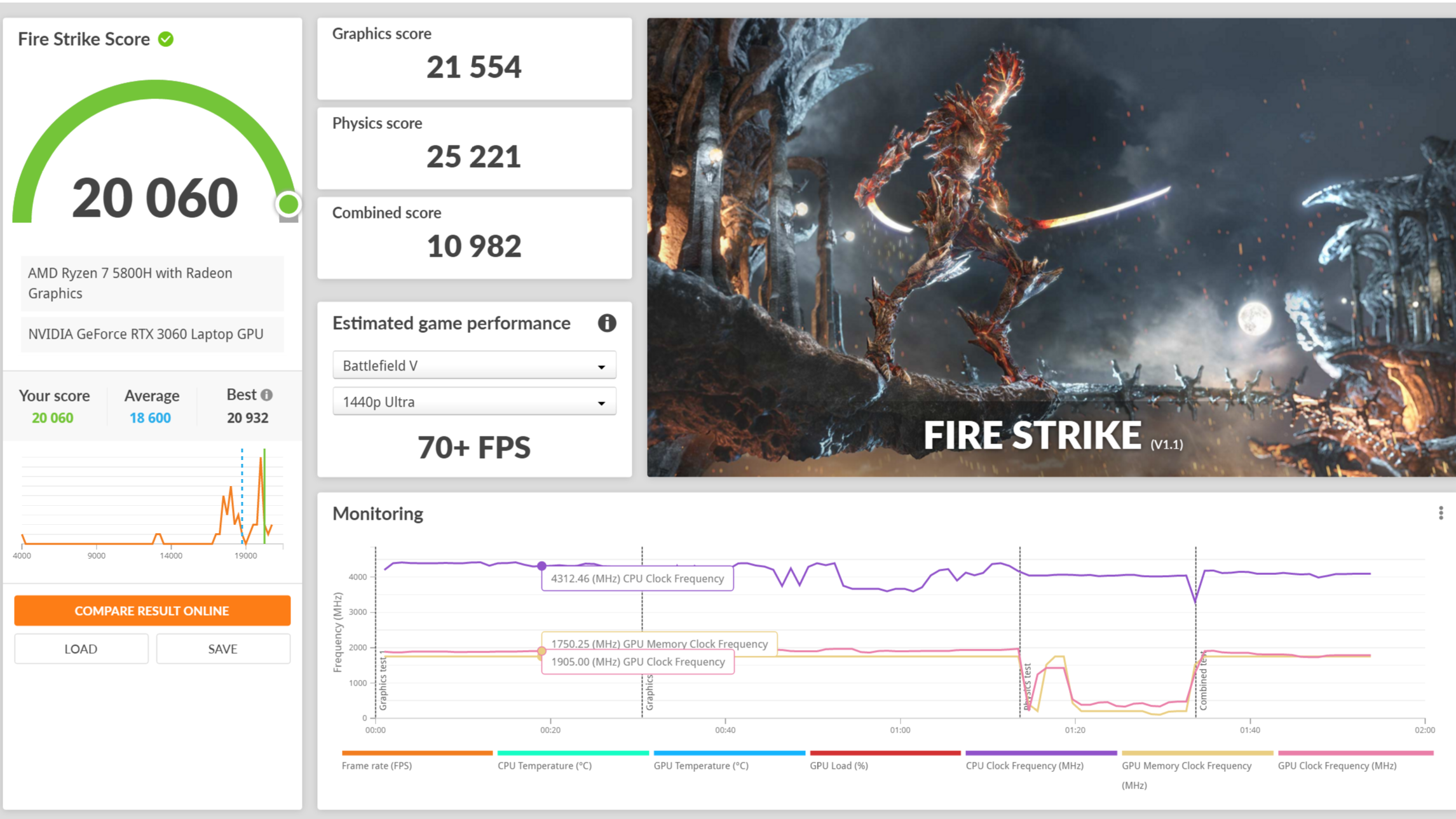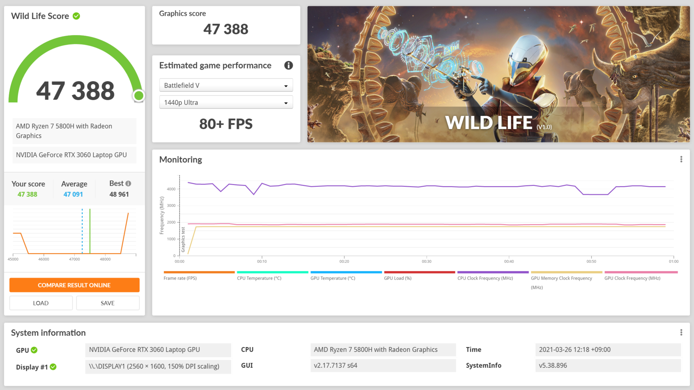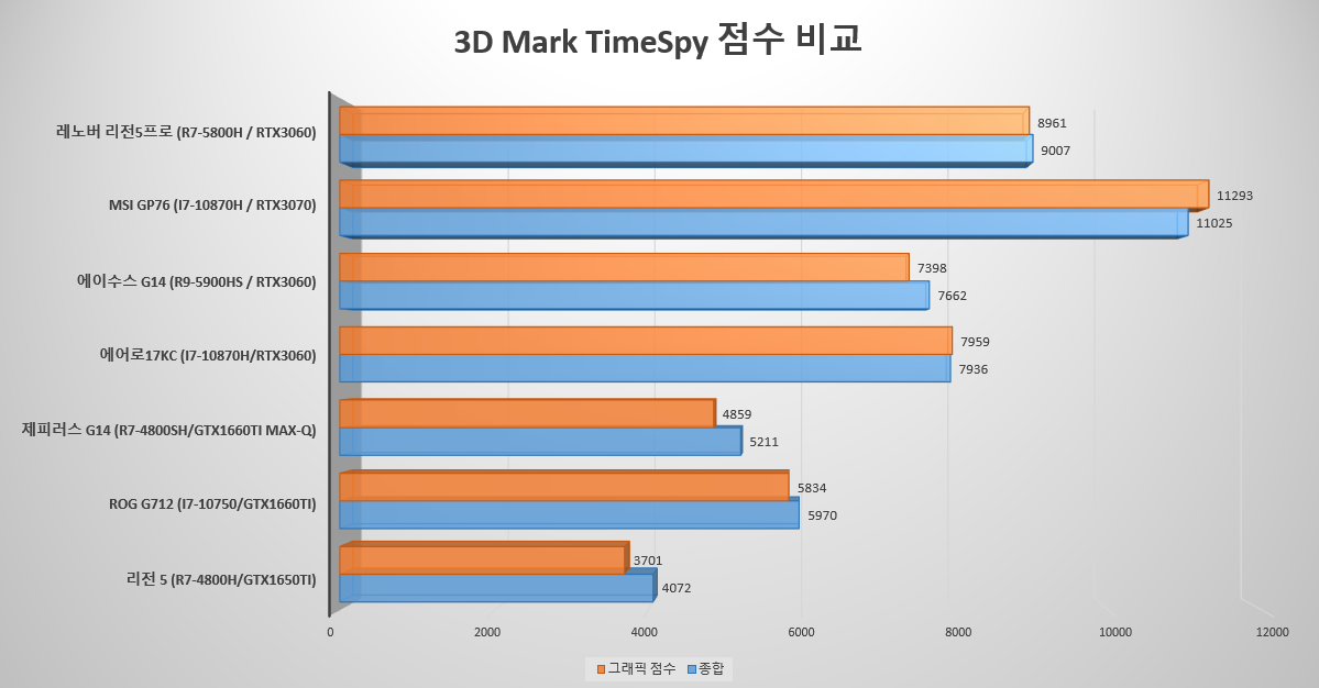 리전5 프로는 제가 사용해본 RTX3060 노트북 중에서 가장 높은 점수를 보여줬습니다. 비슷한 하드웨어 구성이라고 하더라도 쿨링과 전력 유지력이 중요하다는 좋은 예시가 되겠네요.