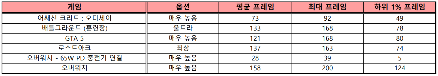 그런데 에이수스 제피러스 G14 모델은 PD 충전기를 연결한 상태에서도 게임 성능이 크게 떨어지지 않았는데, 리전5 프로는 PD 충전기로 사용할 경우 GPU 전력이 30W로 제한되면서 저전력 노트북 수준으로 구동됩니다. 좋게 보자면 PD 충전기 상태에서도 배터리 드레인이 되지 않는다고 할 수 있겠죠...? 저는 개인적으로 배터리 드레인이 있더라도 제피러스 G14처럼 성능 저하가 없는 구성을 선호하는 편입니다.