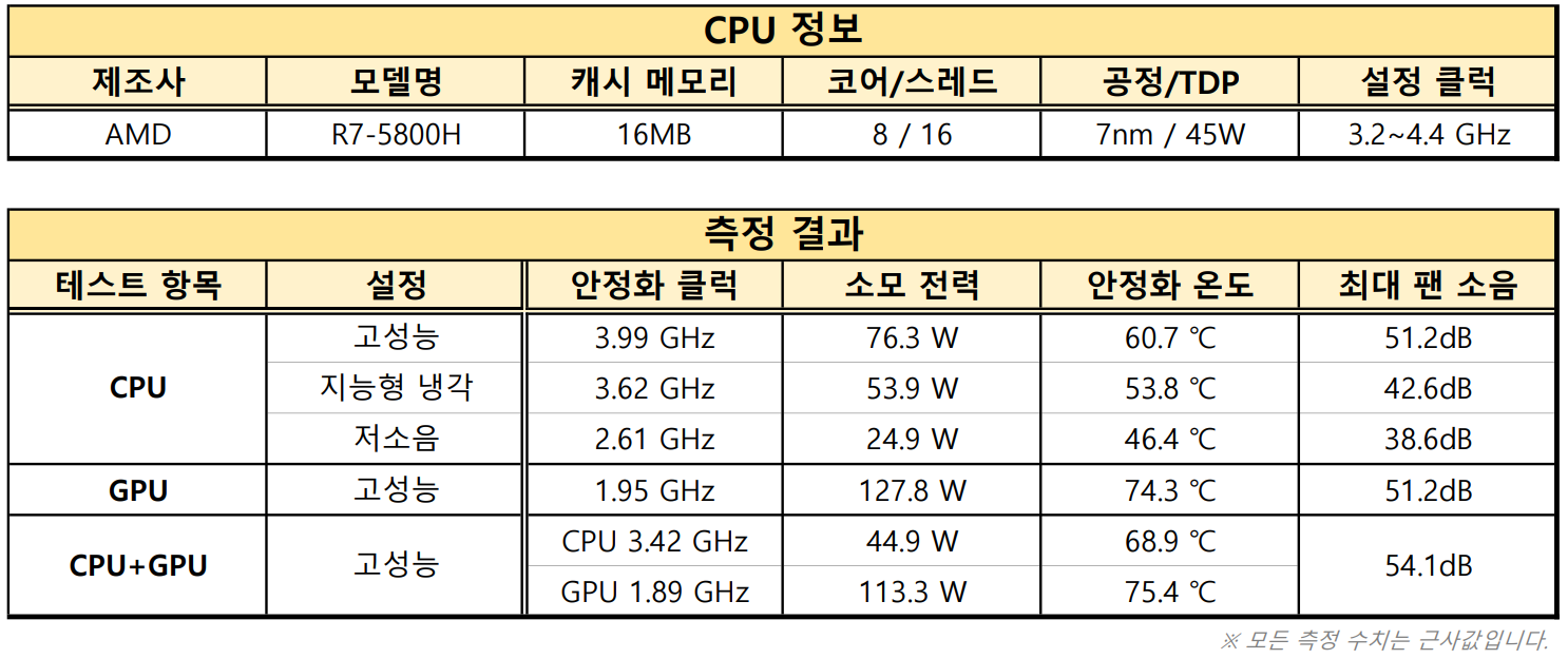 테스트를 하면서 저도 제 눈을 의심할 정도로 리전5 프로의 발열제어 성능은 매우 뛰어났습니다. CPU에 75W 이상을 공급하는 상황에서도 온도가 겨우 60도 정도라뇨? 최근에 테스트한 MSI GP76 모델은 비슷한 상황에서 90도 가까이 올라갔다는 점과 비교하면 엄청난 결과입니다. 물론 MSI GP76 모델은 CPU보다 GPU 쿨링에 최적화된 모델인 점은 감안해야겠지만요.