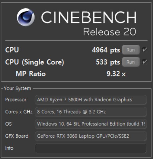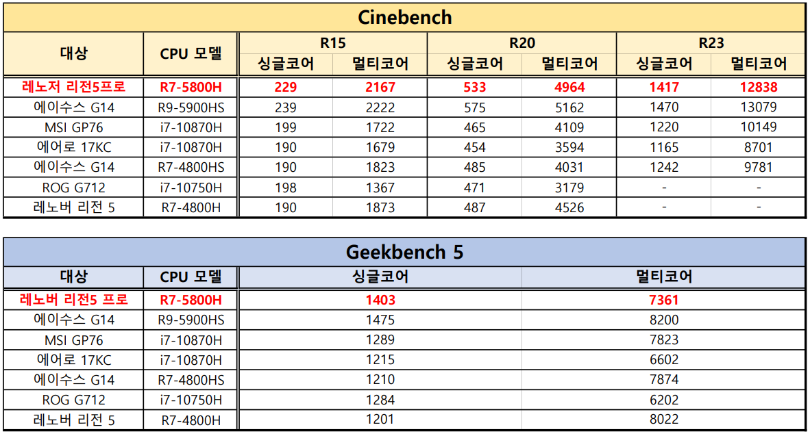 Cinebench는 CPU의 성능을 100% 활용해서 특정 이미지를 얼마나 빠르게 렌더링 하는지 여부를 평가하는 항목. 최신 R23 버전이 테스트 시간이 가장 길기 때문에 발열로 인한 성능 차이가 하위 버전보다 더 뚜렷하게 나타나는 경향이 있다. 싱글코어 테스트는 대체로 발열과 크게 관계가 없는 편이다.