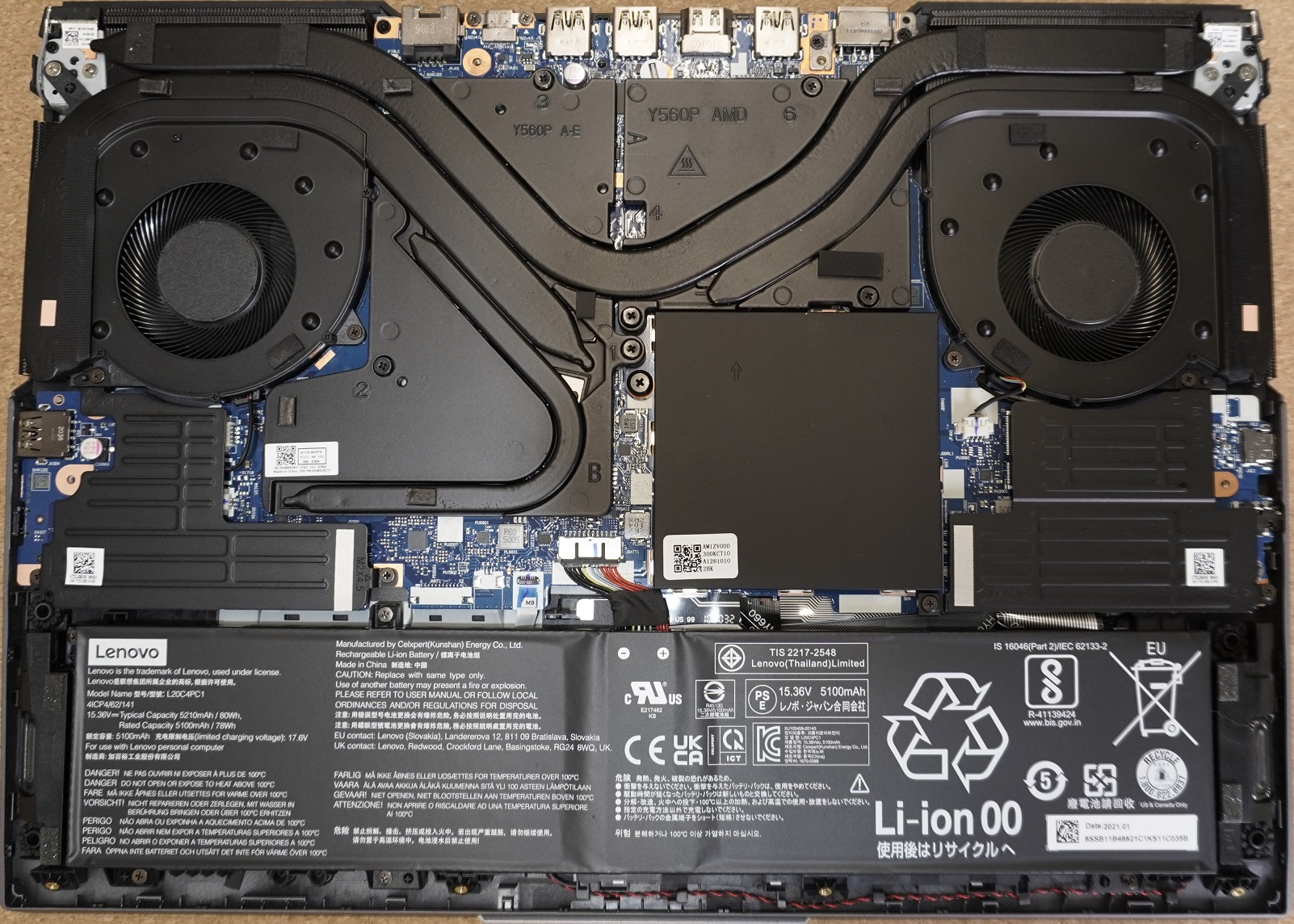 내부의 쿨링 구조는 상당히 특이한 편입니다. 히트파이프 숫자가 적은 대신 거대한 방열판이 내부 구조물을 거의 다 덮고 있는 수준이더라고요. 이 부분에 대해서는 나중에 얘기하겠지만, 의외로 히트파이프만 덕지덕지 붙인 설계보다 방열 효과가 좋다고 느껴졌습니다.