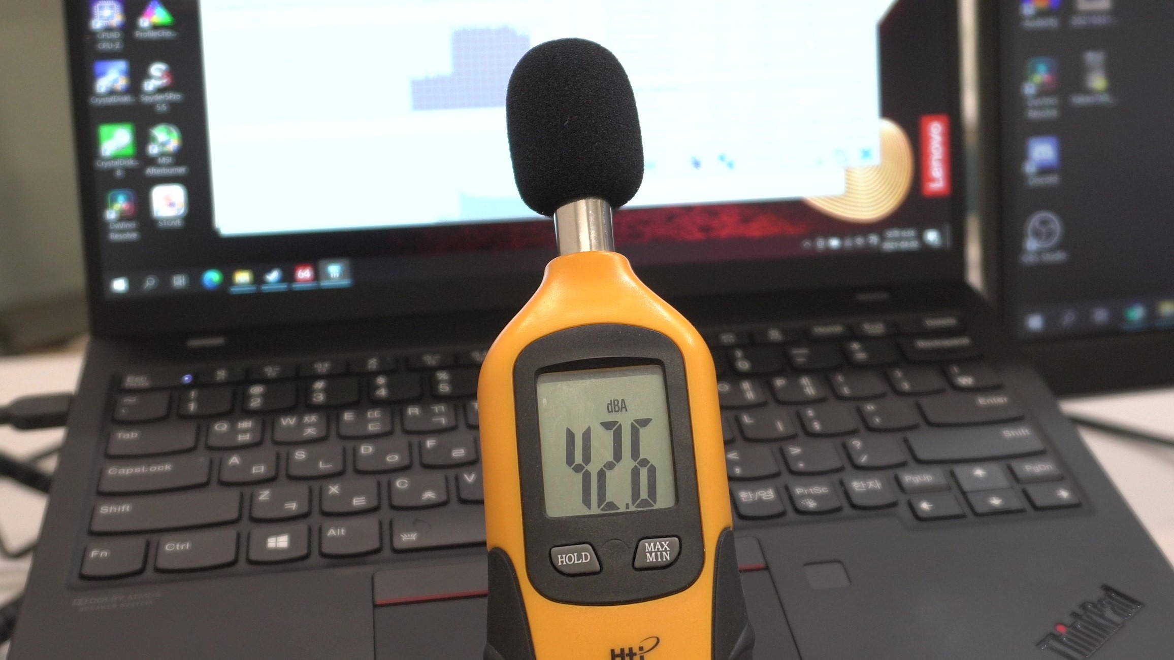 최대 성능 모드 기준으로 측정 소음은 42.6dB 정도로, 독서실 같은 조용한 환경에서 사용하기에는 눈치가 보일 것으로 예상됩니다. 저소음 모드로 구동할 경우 거의 무소음 급으로 조용해지긴 하지만 성능이 반토막 나버린다는 단점이 있죠. 어차피 문서 편집이나 간단한 사진 크기 조절 같은 작업은 저소음 모드에서도 성능 저하가 느껴지지 않는 수준이었기 때문에 크게 걱정할 수준은 아닙니다.