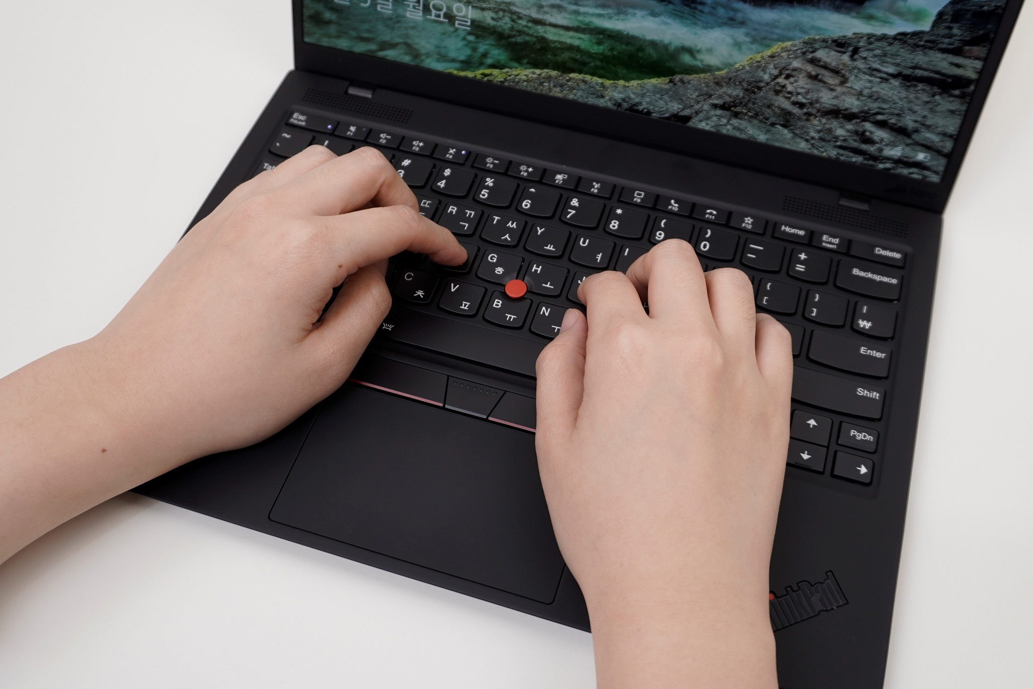 "두께를 줄이기 위해 씽크패드의 정체성이던 키보드 타건감이 약간 너프 됐다. 빨콩 클릭 버튼도 위치가 약간 달라져서 적응이 필요"