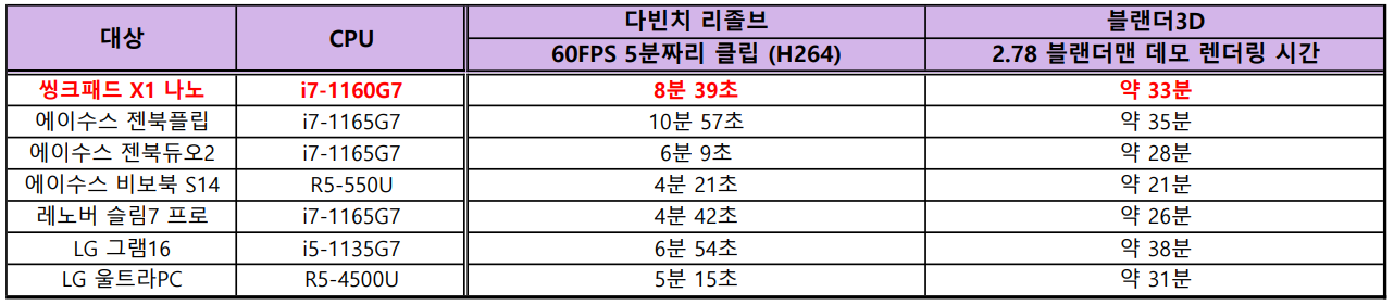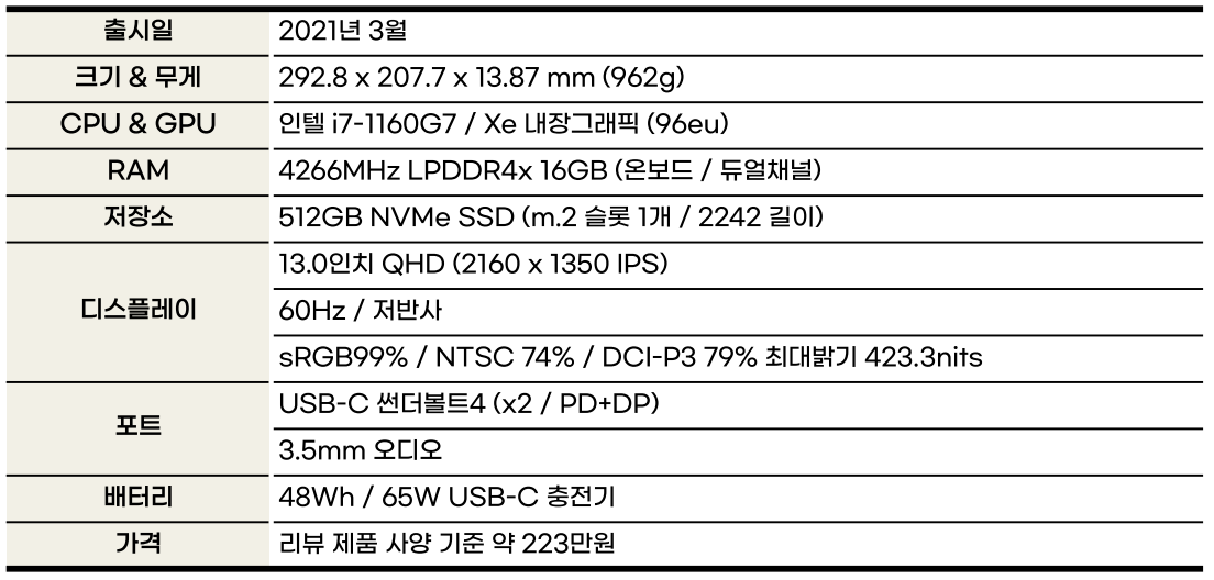 "타이거레이크의 성능을 모두 활용하기에는 역부족, 하지만 서브 노트북의 용도를 생각하면 충분한 성능. 발열은 적어서 사용성은 좋다."