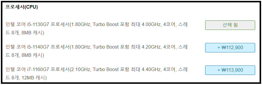 3) CPU 선택 - 서브 노트북이라는 포지션을 생각하면 i5-1130G7 가성비 모델을 추천