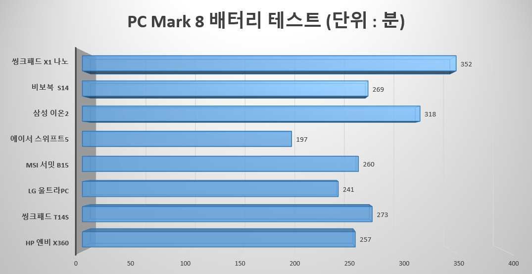 현재 리뷰도 씽크패드 X1 나노로 작성 중인데, 화면 밝기 100% 상태로 배터리가 3시간을 사용해도 배터리를 30%도 사용하지 못했네요. (대충 계산해도 9시간 정도 사용 가능) 보다 부하가 높은 PC Mark 배터리 테스트도 6시간 가까이 버텼으니 어지간해서 하루 일과 시간 중에 배터리가 다 떨어져서 고생할 일은 없지 않을까 싶습니다.
