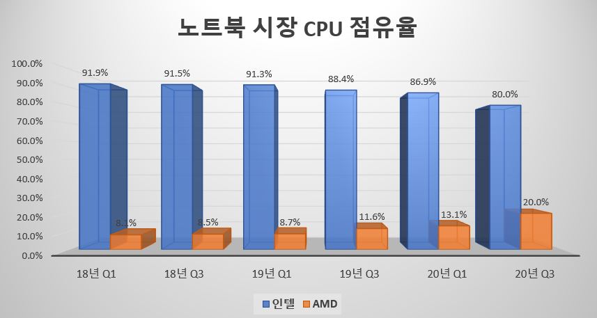 통계 자료를 보면 이미 2019년 “피카소” 제품군이 출시됐을 때부터 노트북 시장에서 AMD 라이젠 CPU의 점유율이 급상승하고 있다는 것을 확인할 수 있습니다.