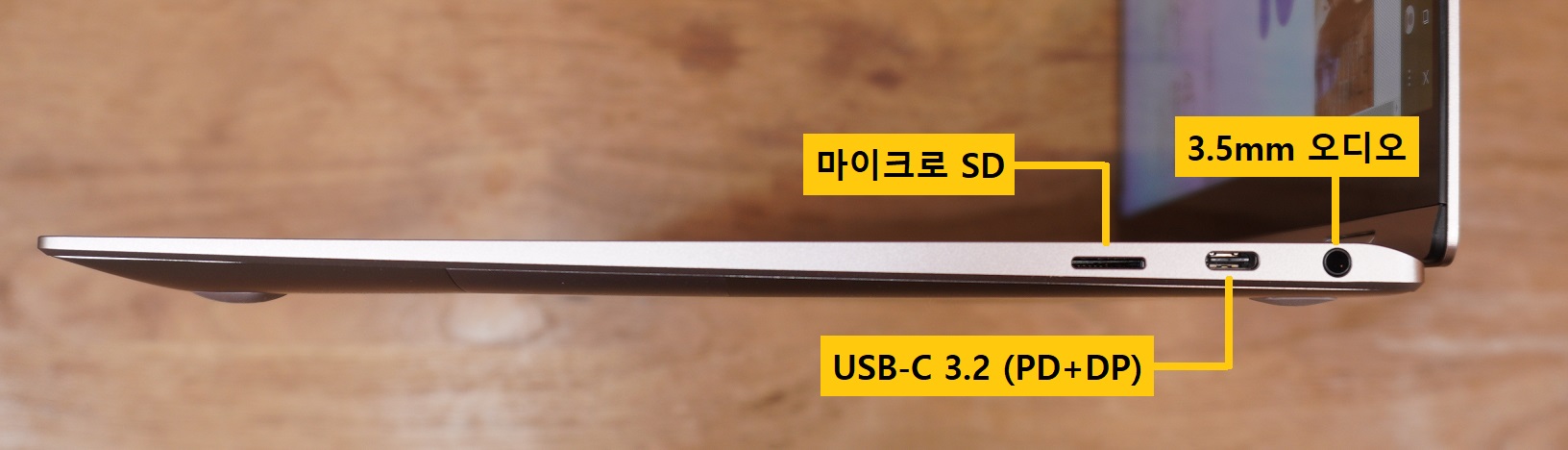 갤럭시북 프로 360은 USB-C 포트 3개와 마이크로 SD 슬롯, 3.5mm 오디오 단자밖에 없습니다. USB-A 포트가 없어서 사용할 때 불편한 상황이 발생할 수는 있겠지만, 노트북의 두께를 생각하면 도저히 HDMI나 USB-A를 달아줄 수는 없었을 것 같아요. 그나마 3.5mm 단자까지 넣어준 것이 용하다는 생각이 들 정도랄까요...?