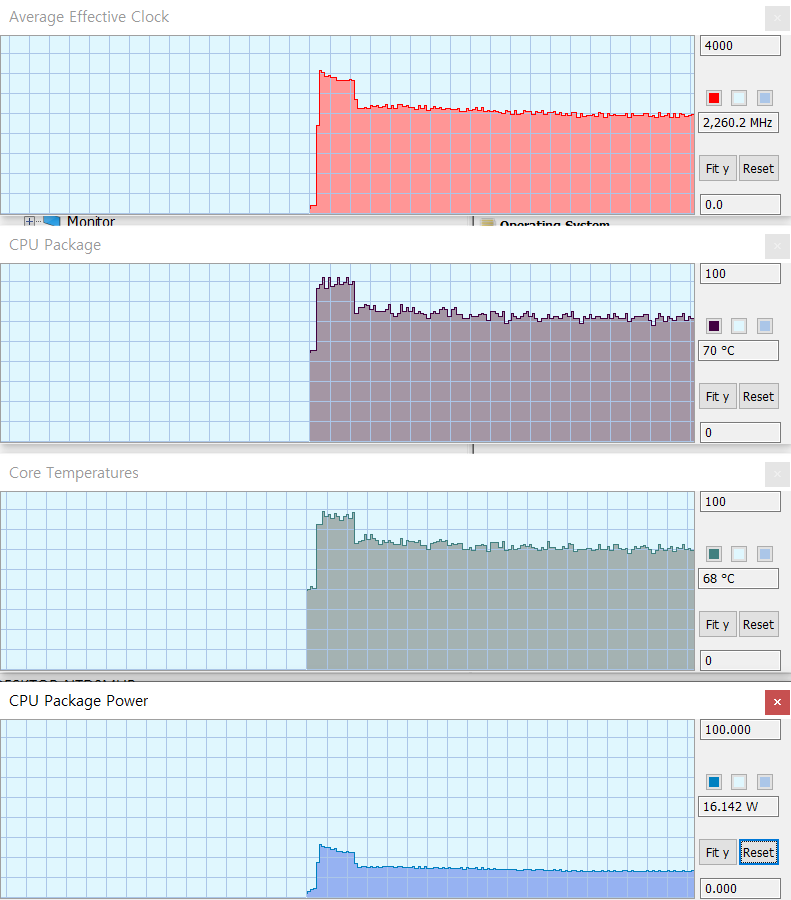 CPU나 GPU에 100% 부하를 주는 상황에서 노트북이 각 하드웨어에 전력을 얼마까지 공급할 수 있는지, 그리고 해당 전력을 유지할 때 내부 온도가 어느 정도로 유지가 되는지 확인하는 테스트. 유지 가능한 전력이 높을수록 대체로 성능이 좋지만, 내부 온도나 팬 소음이 커지는 경향이 있다.