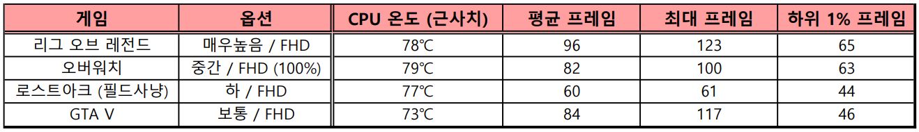 아무리 평균 프레임이 좋아도 하위 1% 프레임이 낮으면 순간적인 렉이 많다는 의미이기 때문에 플레이 경험이 쾌적하지 못하다. (하위 1%는 최소 30~40FPS 이상을 기대)