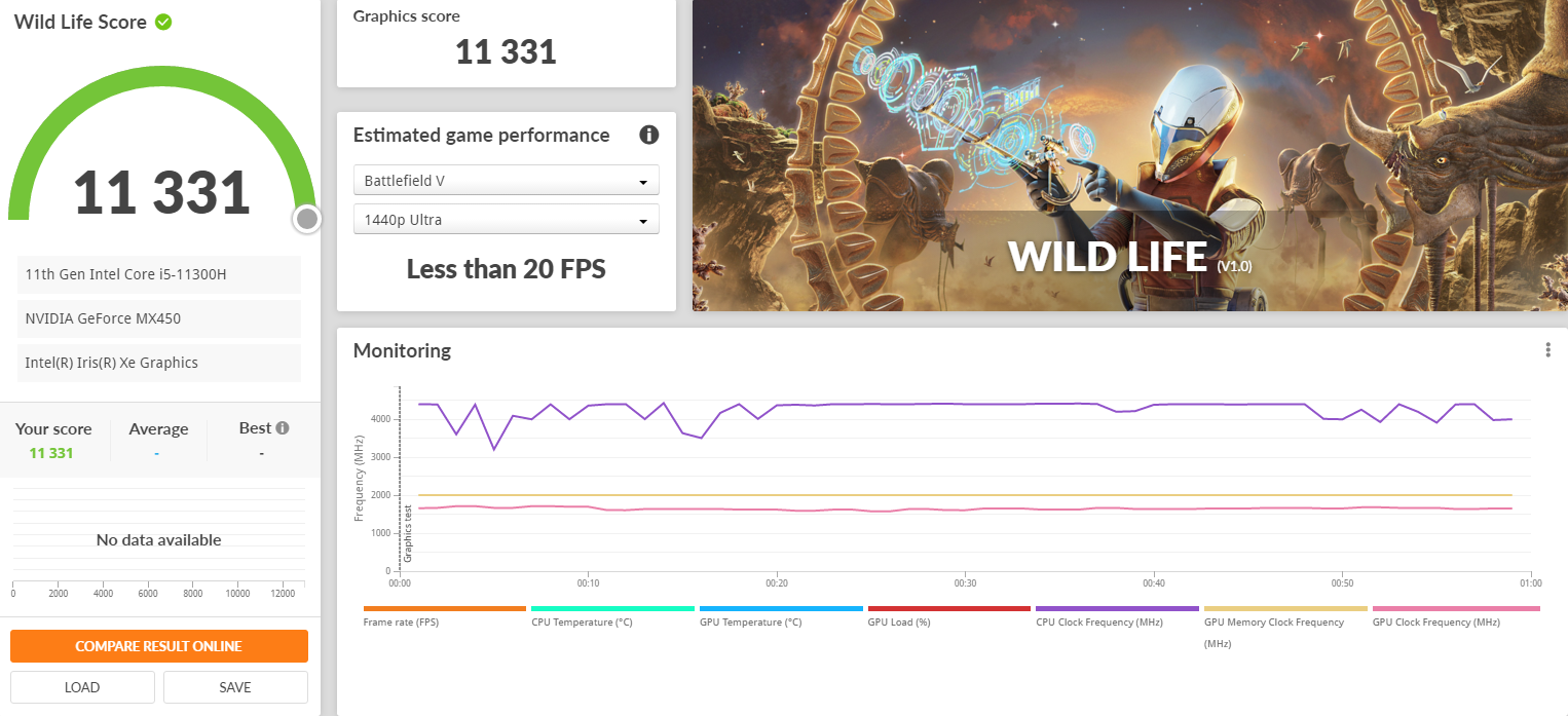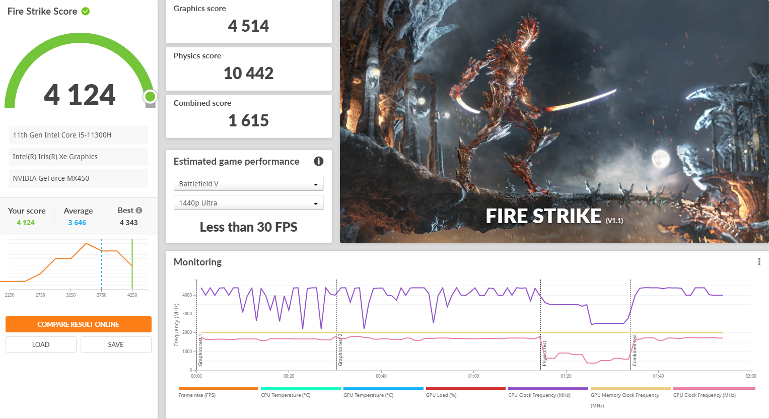 노트북의 스펙에 알맞다고 판단되는 그래픽 옵션으로 게임을 구동했을 때 유지되는 프레임 값을 측정한 것. 일반적으로 평균 프레임이 디스플레이의 한계 주사율(Hz)에 근접하는 패턴이 가장 이상적이며, 쾌적한 플레이를 위해서 최소 60FPS 이상으로 구동되는 것이 좋다.